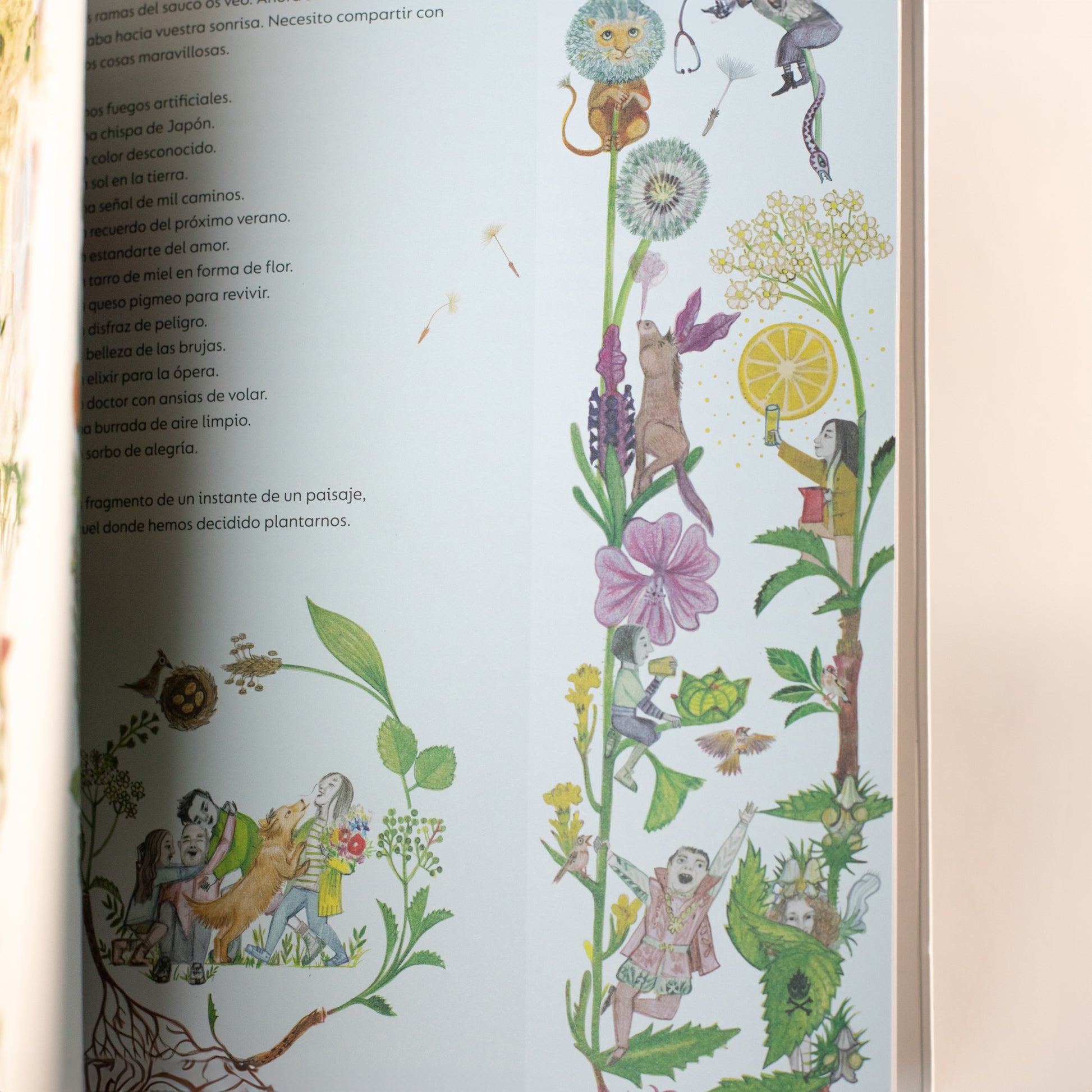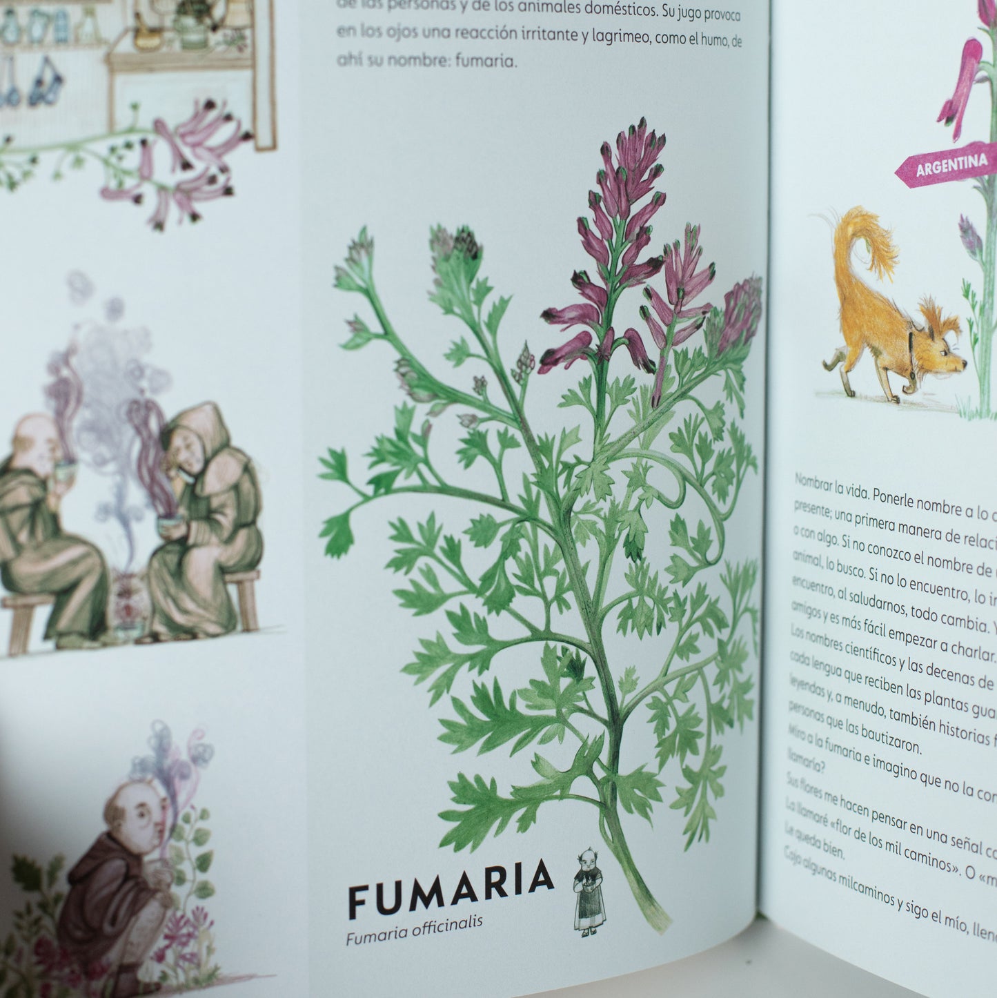 Las ilustraciones de María Pascual reproducen con belleza y precisión cada elemento vegetal, al mismo tiempo que en constante diálogo con el texto dibujan detalladas escenas que harán sonreír –y a veces incluso reír– a cualquier lector.